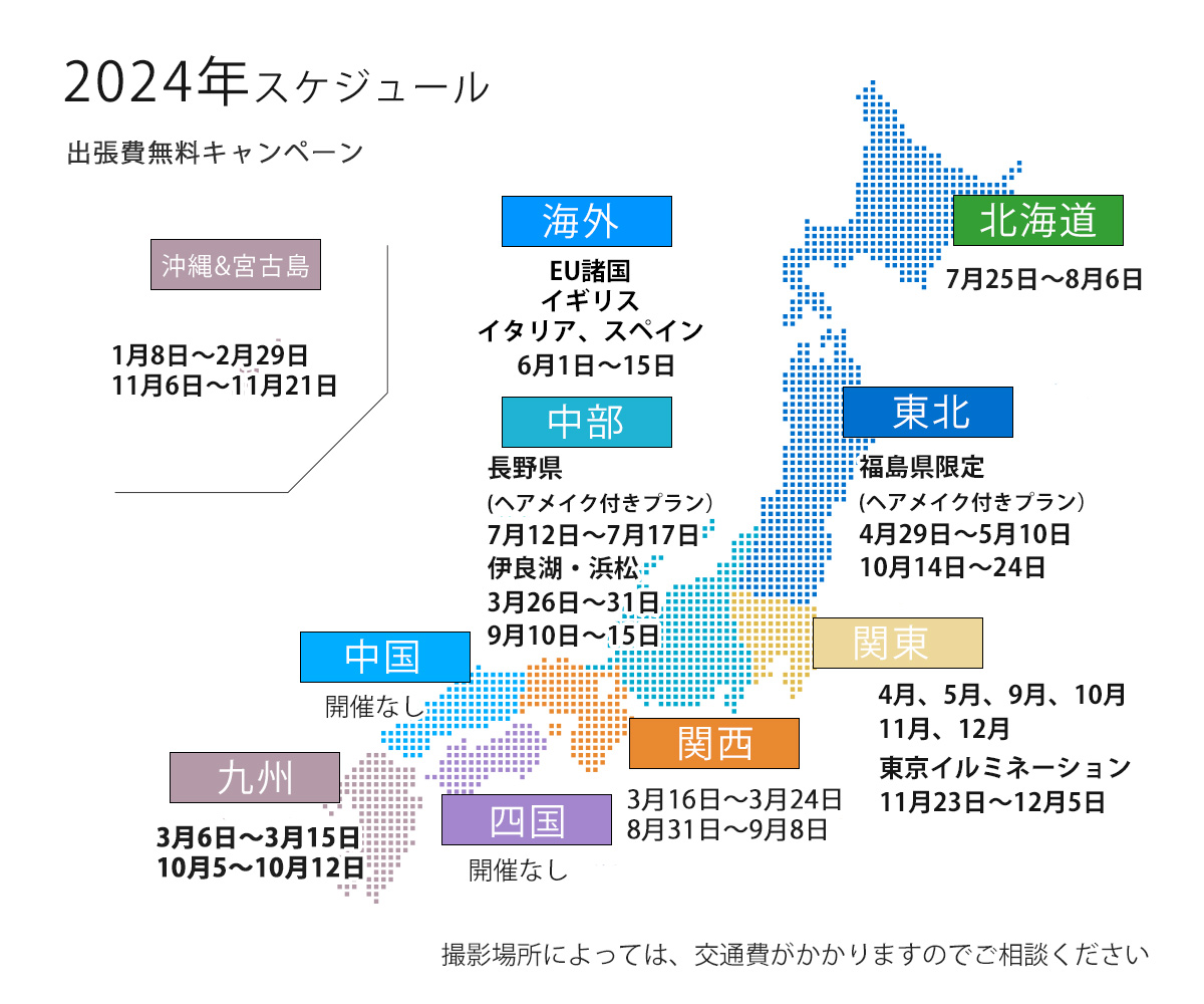 ※天気予報で当日から2日前の天気を確認して、雨天決行の場合は屋根付きの施設など雨の当たらない場所にて撮影決行とさせて頂きます。